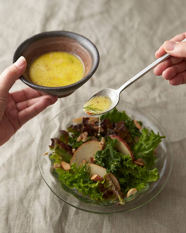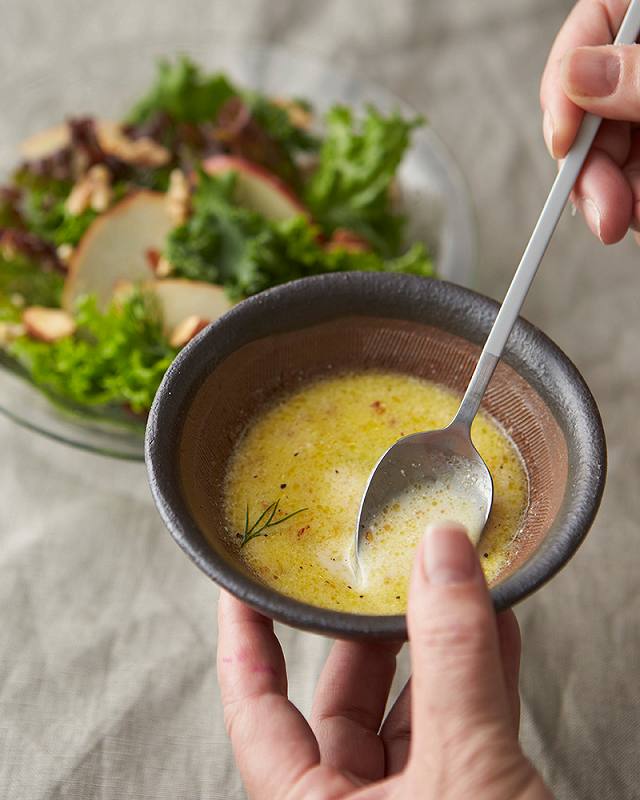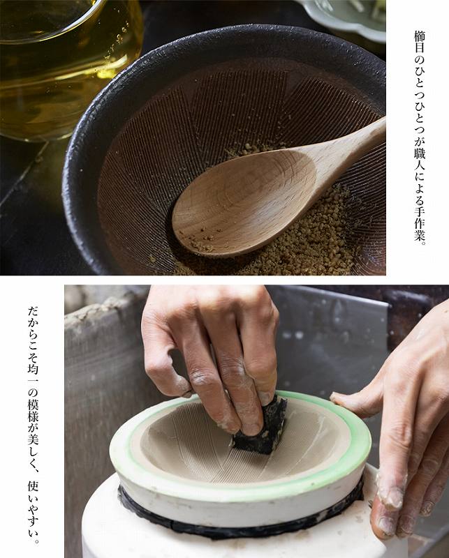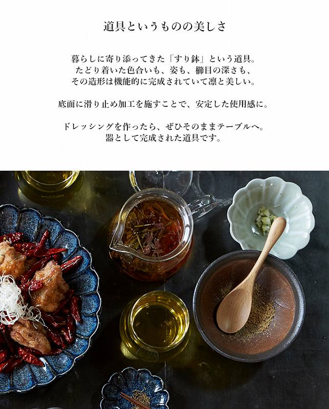 道具というものの美しさ。暮らしに寄り添ってきた「すり鉢」という道具。たどり着いた色合いも、姿も、櫛目の深さも。その造形は機能的に完成されていて凛と美しい。ドレッシングを作ったら、ぜひそのテーブルへ。底面に滑り止め加工を施すことで、使用時の安定感がアップ。