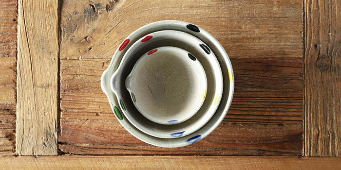 大根、やまいも、薬味…、和食では使用頻度の高いすり鉢に、おしゃれな水玉模様を描いたら…、和陶ならではのぬくもりあふれる器になりました。道具としての使いやすさと、器としての意匠性を兼ね備えたスグレモノです。