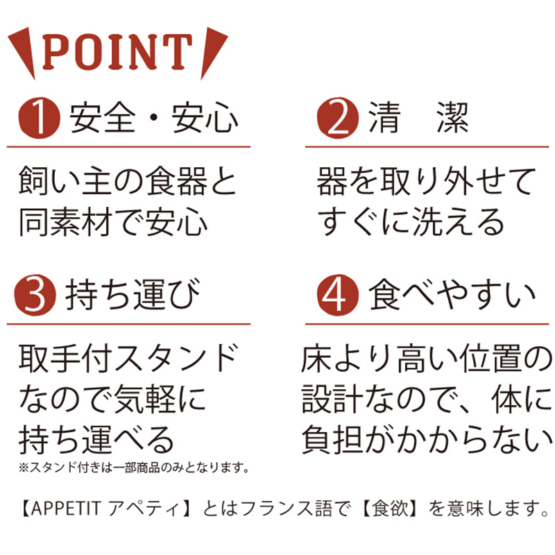 【APPETIT アペティ】とはフランス語で【食欲】を意味します。大切なペットにはいつでも快適に、美味しく、たくさんのご飯を食べてもらいたいもの。そんな思いを形にしたのが、ペットのための食器【APPETIT】です。ペットはもちろん、飼い主さんにとってもストレスフリーな使いやすく食べやすい食器です。