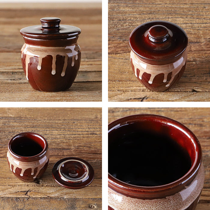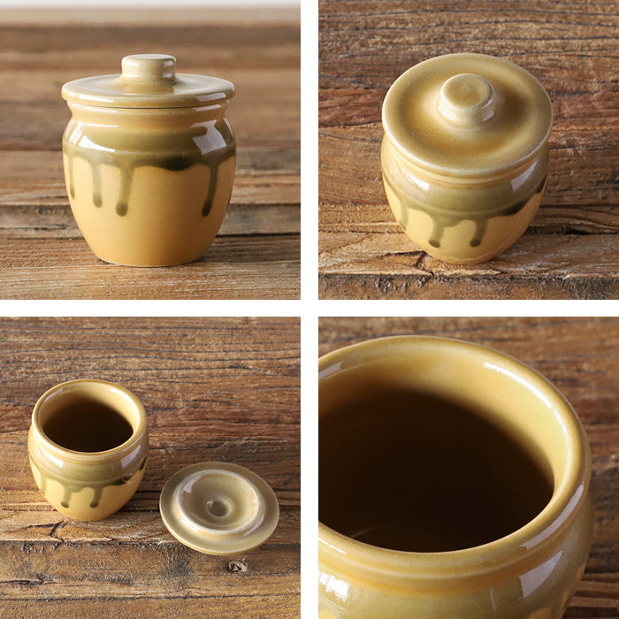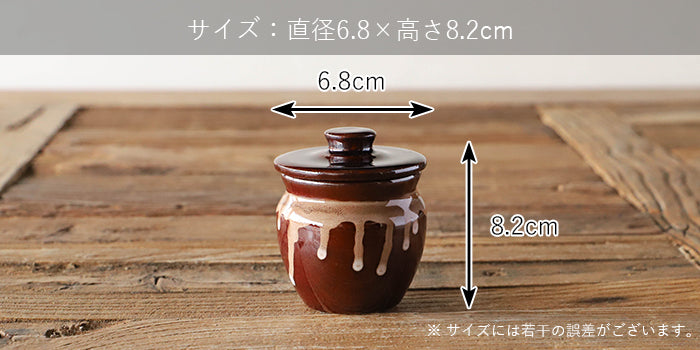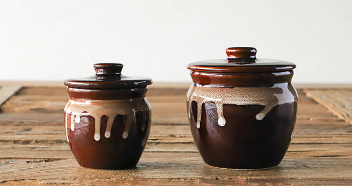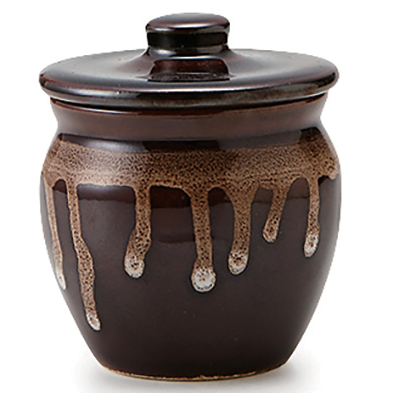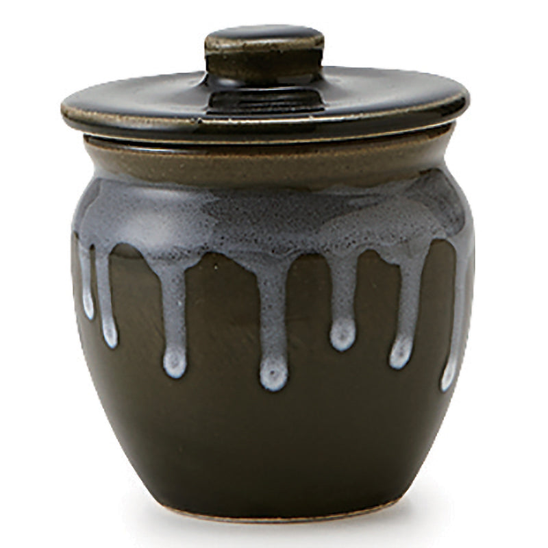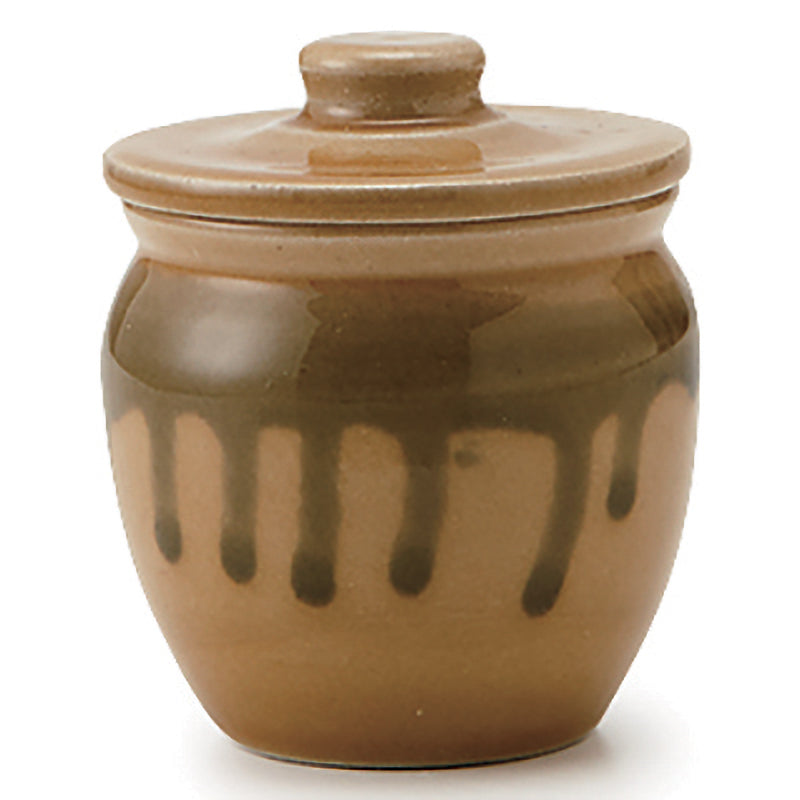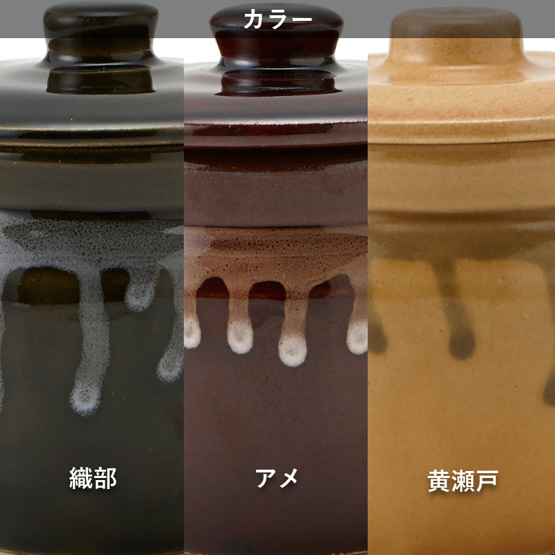 ぽっこりしたカタチが愛らしい昔ながらの蓋付き瓶(かめ)。美濃焼伝統の色で仕上げました。梅干し、たれ、味噌などの保存に。