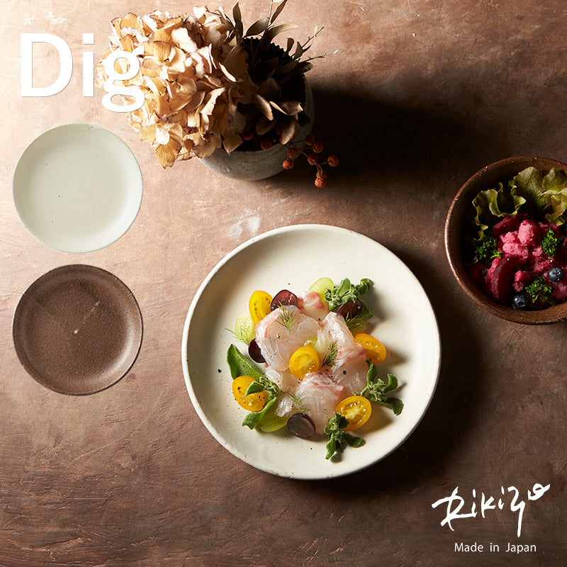 土から掘り出したばかりの素材感、洗練された佇まいをミックスした【Dig】シリーズ。ムダのないデザインは、和食でも、洋食でも、万能にお使いいただけます。煮魚ときんぴら、酢の物、ロールキャベツにサラダとパスタ、今夜はDigに何を盛りつけますか?