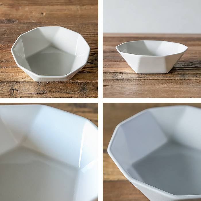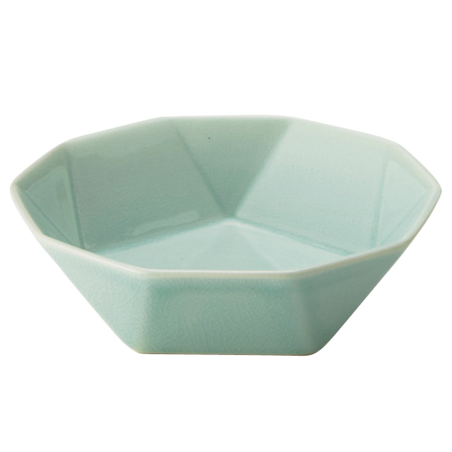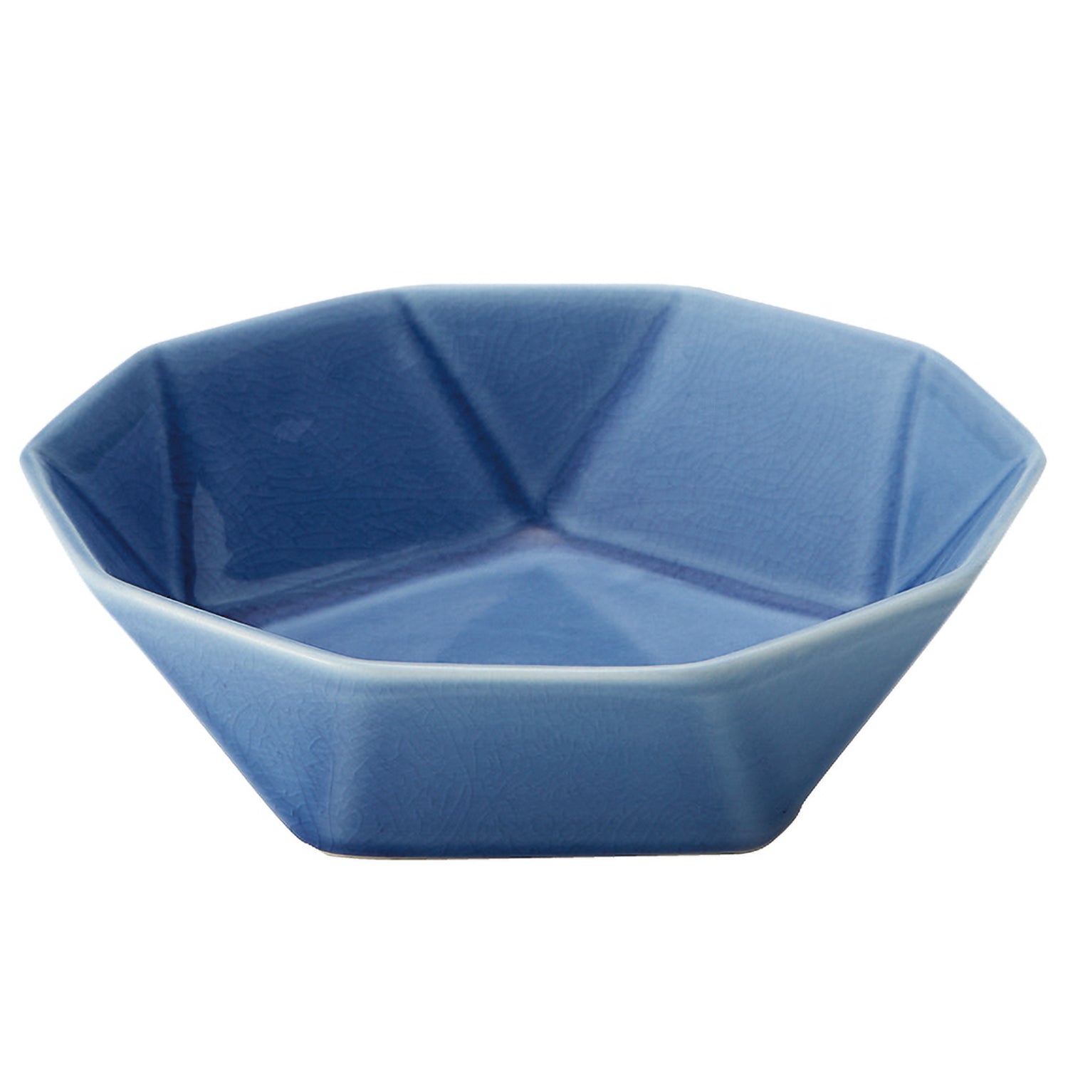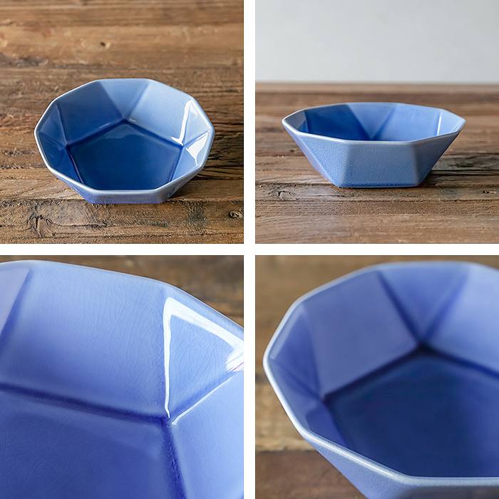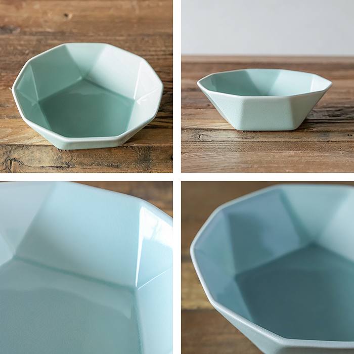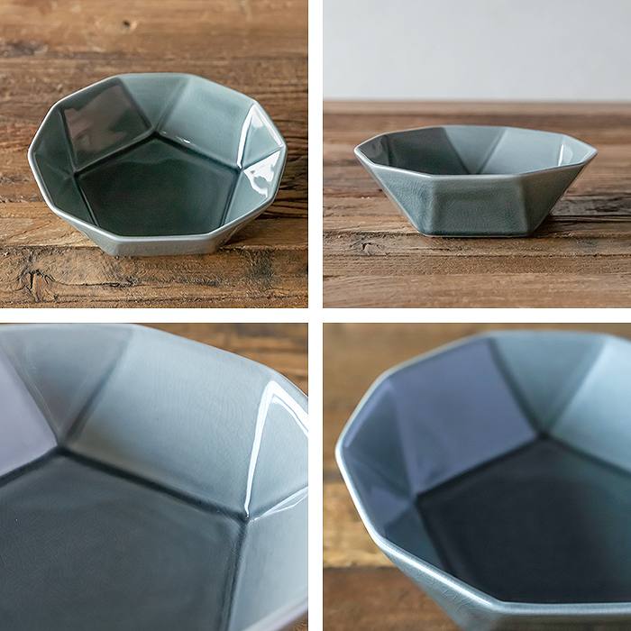 個性的な多角形に美しい色をのせた、「GOKAKU ゴカク」シリーズの器。多角形のラインに沿って変わる釉薬の色の濃淡は、自然に生まれた美しさ。ひとつとして同じものの無い「貫入」も魅力のひとつです。色違いやサイズ違いのお皿といっしょにそろえてコーディネートするのも心が踊ります。