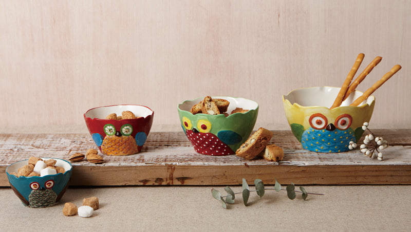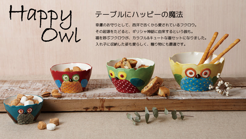 幸運のお守りとして、西洋で古くから愛されているフクロウ。その起源をたどると、ギリシャ神話に由来するという説も。福を呼ぶフクロウが、カラフル&キュートな器セットになりました。入れ子に収納した姿も愛らしく、贈り物にも最適です。