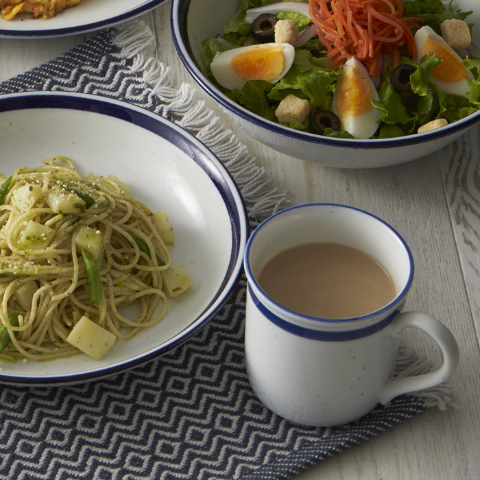 清潔感のある白い地にブルーのラインがくっきり。ミニマルを極めたデザインは、どんな料理とも自然になじむ。二人の暮らしもこんなふうに、心地よくナチュラルが理想。