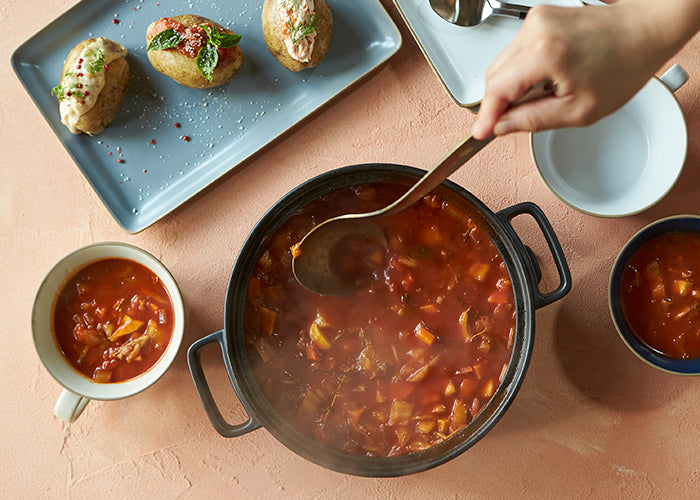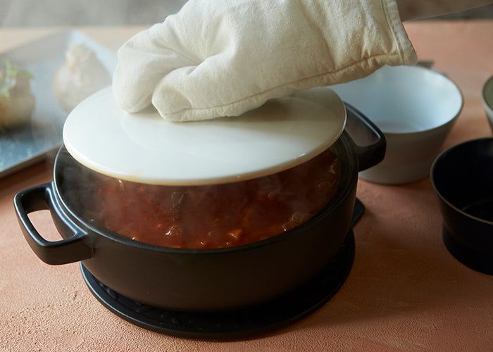 スクエアな形のハンドルがオシャレで上質な土鍋『TOTE』。いつもの水炊きはもちろん、洋風鍋や煮込み料理も様になります。土鍋を使ったお料理が楽しみになるデザインです。